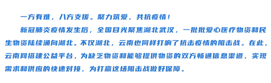 )和立心青年创新中心发起,旨在畅通抗疫物资供需信息的渠道,收集云南省各医疗机构、公益组织等物资和服务需求方(简称“需方”)发布的物资需求信息,并提供物资需求信息来源的网络渠道,同时为需方与物资和服务提供方(简称“供方”)搭建信息桥梁。
