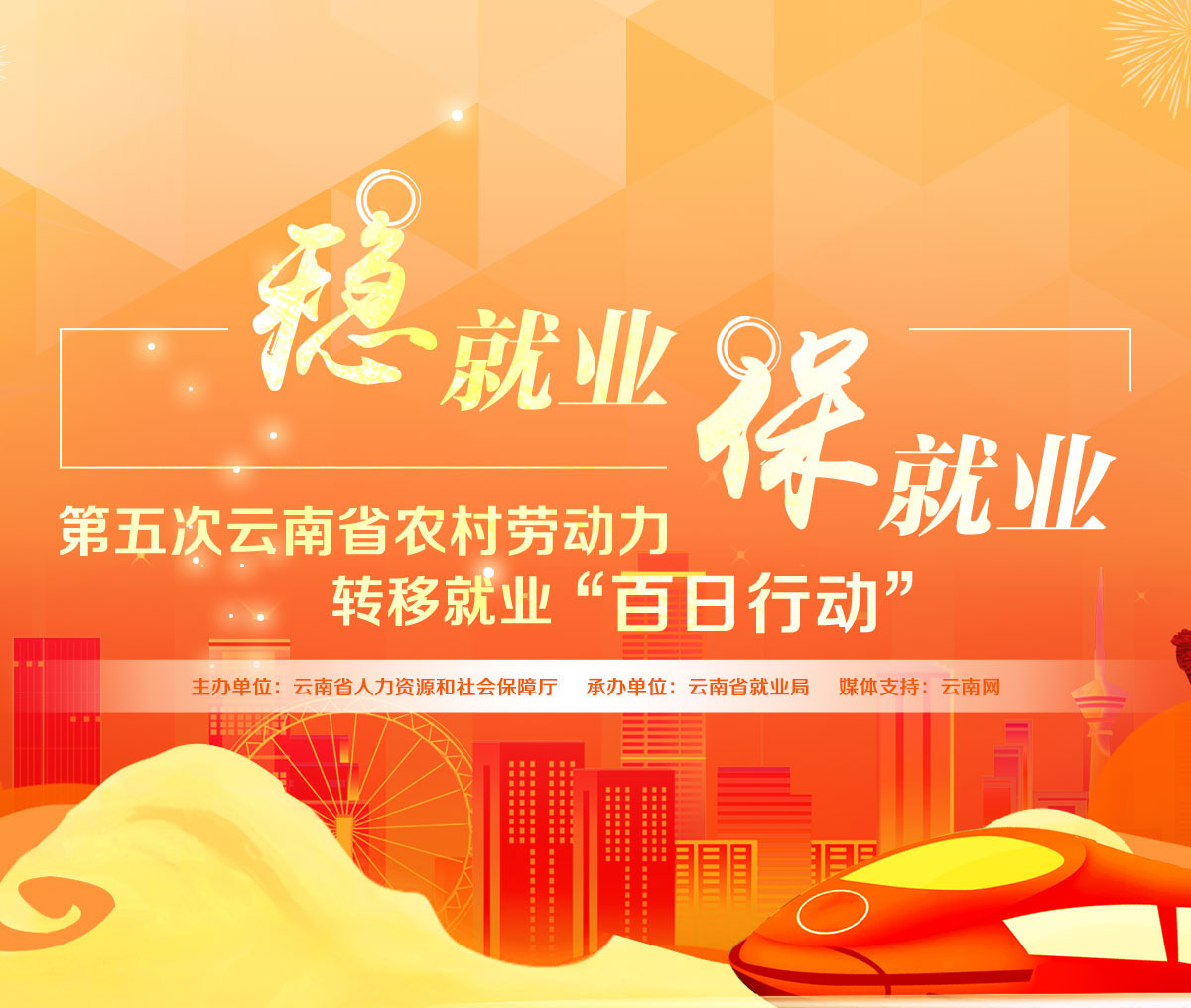 为深入贯彻落实党中央、国务院关于“稳就业”“保就业”决策部署,统筹推进全省常态化疫情防控与农村劳动力转移就业工作,有效促进我省农村劳动力更充分更高质量就业,2021年1月1日至4月10日,云南省人力资源和社会保障厅开展以“奋战一百天,确保开门红”为主题的第五次全省农村劳动力转移就业“百日行动”。