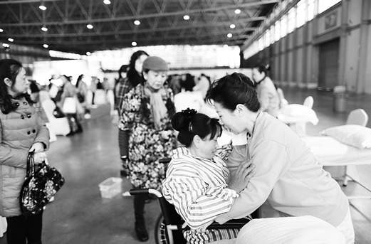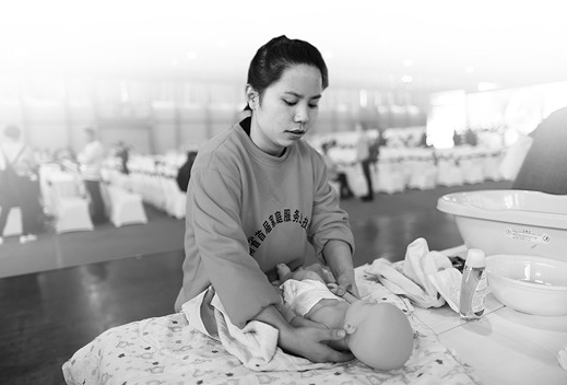 在母婴护理竞赛区,月嫂们要分别为面前的“宝宝”洗脸、洗头、洗澡、抚触、穿衣。“宝宝,阿姨给你洗澡啦,来,我们把小手抬起来……”比赛现场,月嫂们面带微笑,开始和“宝宝”们互动。整个过程中,月嫂的操作顺序、操作熟练程度、亲和力等都会纳入考评标准。现场除了有专业评审,婴儿抚触环节还采用大众评审的方式由普通市民进行投票。