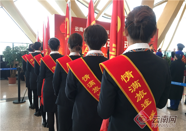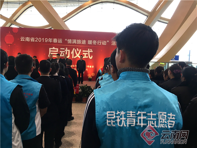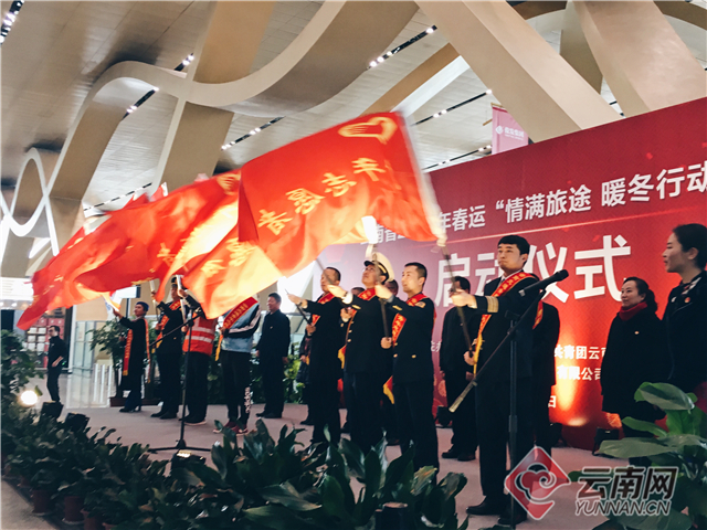 上午10时,一批由铁路、公路、水运、民航等交通运输单位组成的上百名青年志愿者聚集在昆明长水机场。他们在机场出发厅内接过“青年志愿者”旗帜,并进行宣誓,励志在为期40天的春运期间,全心全意为旅客服务,帮助旅客温暖回家,幸福过年。