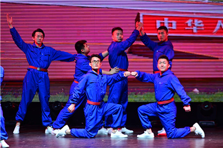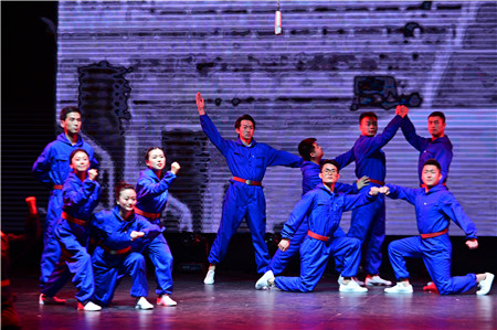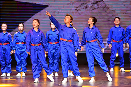 这20余人时而散开,时而齐聚,他们舞蹈时动作整齐划一,眼神坚毅,精神抖擞,诵读时声音洪亮。蓝色工装配上白色的运动鞋,将他们的年轻和活力四射展现得淋漓尽致。