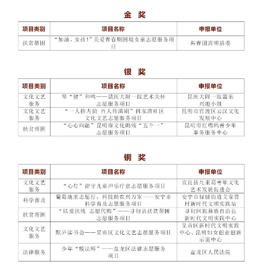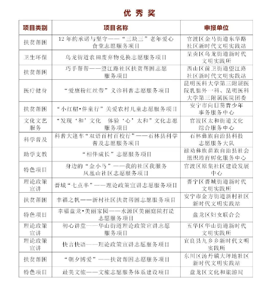 昆明市第二届“‘新’火燎原”新时代文明实践志愿服务项目大赛获奖项目名单: